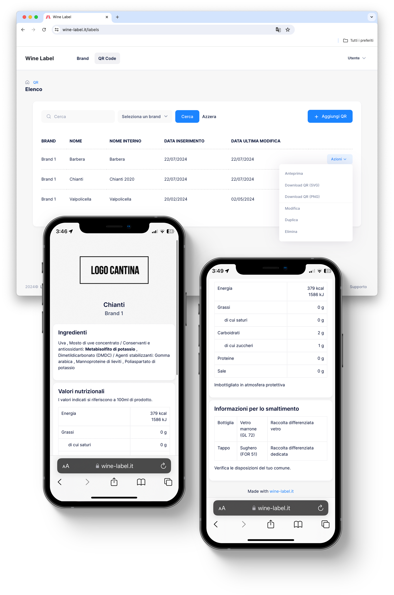 FunzionalitàCon il Regolamento (UE) 2021/2117 è stato introdotto l'obbligo di indicare i valori nutrizionali dei vini. Per ottemperare a questo obbligo è sufficiente apporre un QRCode sull'etichetta che rimandi ad una pagina in cui vengono indicate tutte queste informazioni.